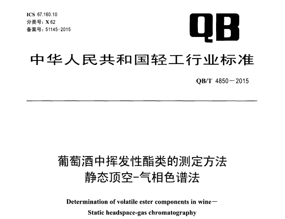 QBT 4850-2015 葡萄酒中揮發性酯類的測定方法 靜態頂空-氣相色譜法 適用范圍本標準規定了葡萄酒中揮發性酯類的靜態頂空-氣相色譜法的原理、試劑和材料、儀器和設備、分析步驟... 更新日期:2020-05-09 下載包(1)