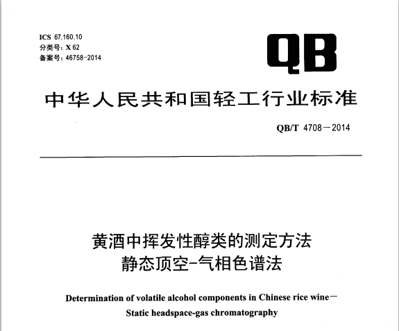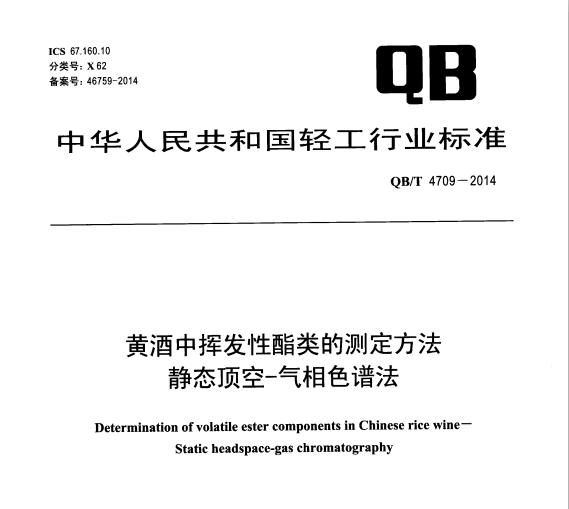 QBT 4709-2014 黃酒中揮發性酯類的測定方法 靜態頂空-氣相色譜法 QB/T4709-2014黃酒中揮發性酯類的測定方法靜態頂空-氣相色譜法 本標準規定了黃酒中揮發性... 更新日期:2020-05-09 下載包(1)