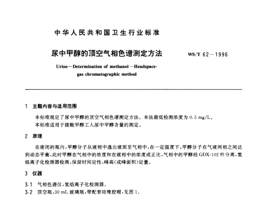 WST 62-1996 尿中甲醇的頂空氣相色譜測定方法 本標準規定了尿中甲醇的頂空氣相色譜測定方法.本法最低檢測濃度為0.5mg/L.本標準適用于接觸甲醇工... 更新日期:2020-05-09 下載包(1)